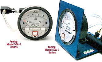 The Model 50A combines a Laminar Flow Element (LFE) and an analog gage in various mounting methods. All Model 50A flowmeters offer ±2% Full Scale Accuracy. They are inexpensive, accurate replacements for variable area flowmeters with the following advantages: